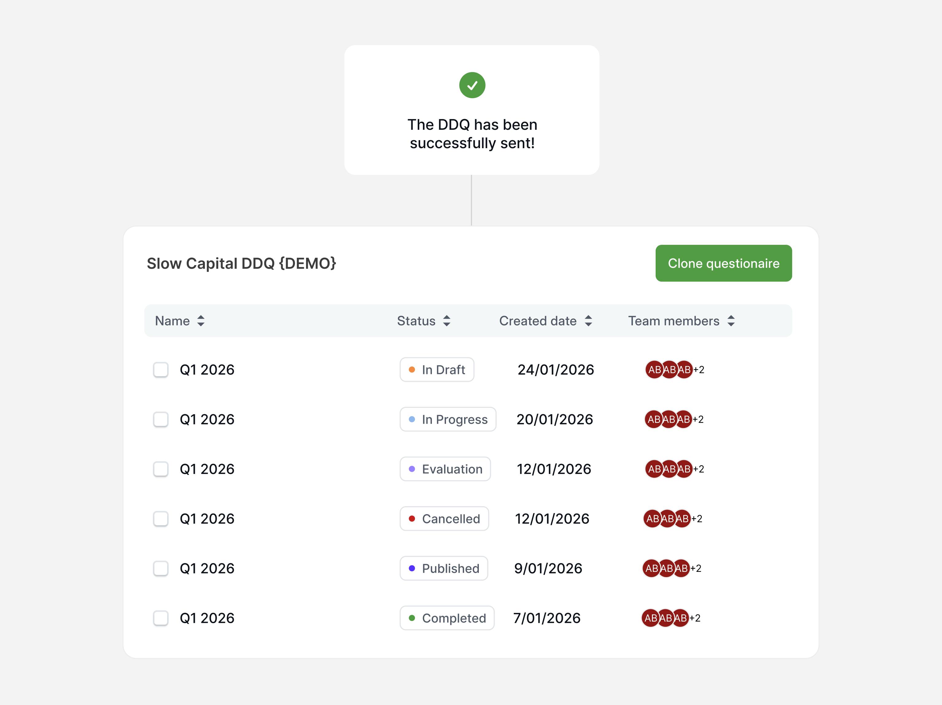 Build once and reuse often. Easily import past RFPs or DDQs, turn them into templates, and reduce redundant work across your team.