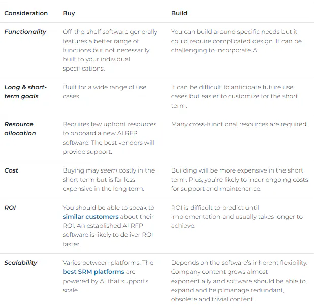 Chances are your proposal teams are inundated with RFPs, so a short-term goal might be to simply stay above water. In that case, buying gives you the most immediate benefits. Going with an industry leader in AI RFP software also ensures that you’ll be ready for any emerging use case in the long term.