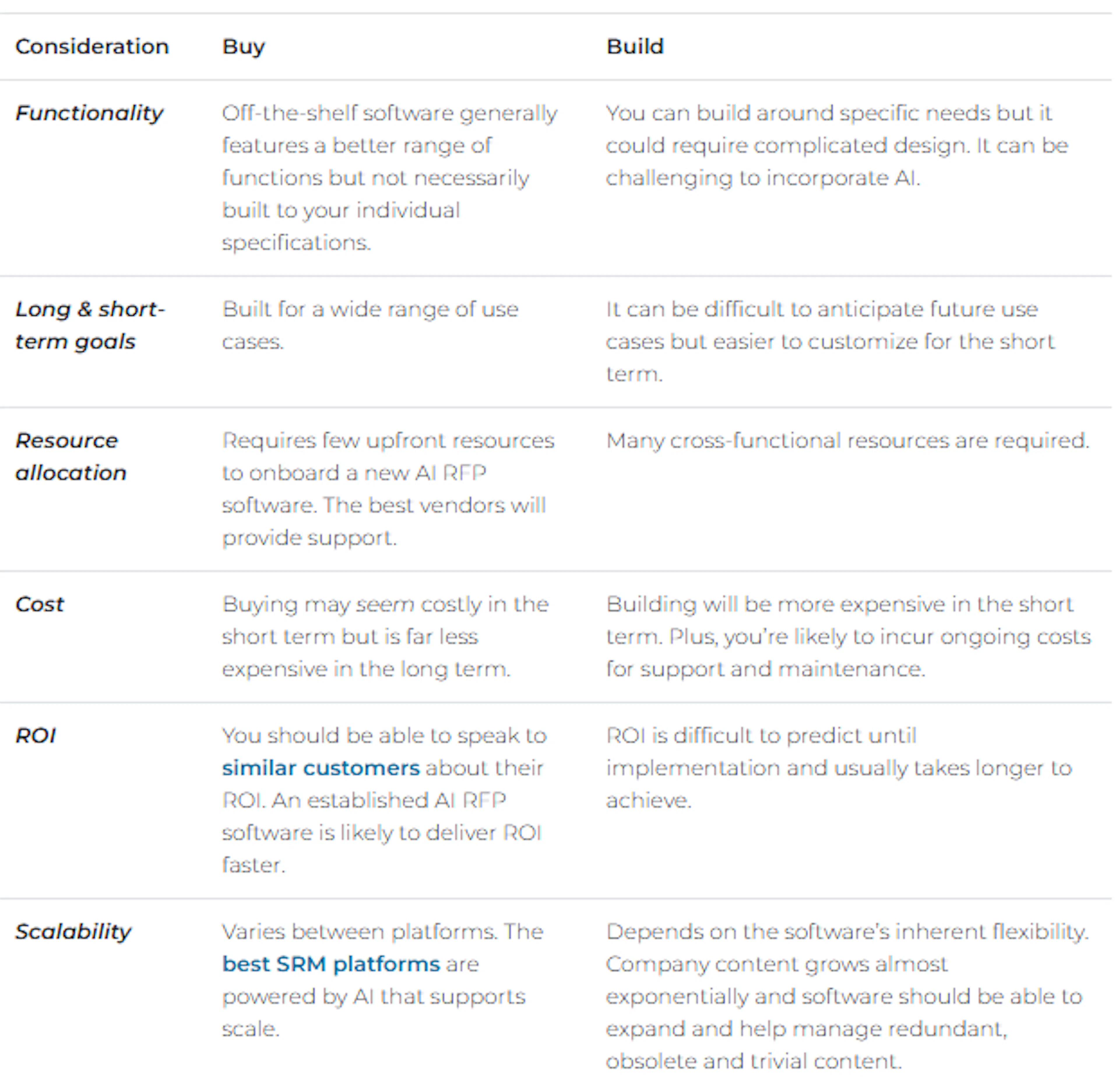 Increasingly, the question is not whether to incorporate AI RFP software into response processes but whether to buy an existing platform or build one.