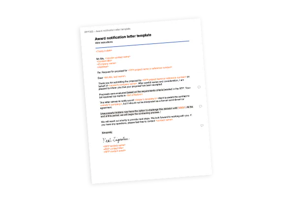 At the end of your RFP process, after scoring and evaluating the proposals, it’s time to make your selection. Once you’ve selected the best fit, you get to share the good news. Use this award notification letter template to get started.