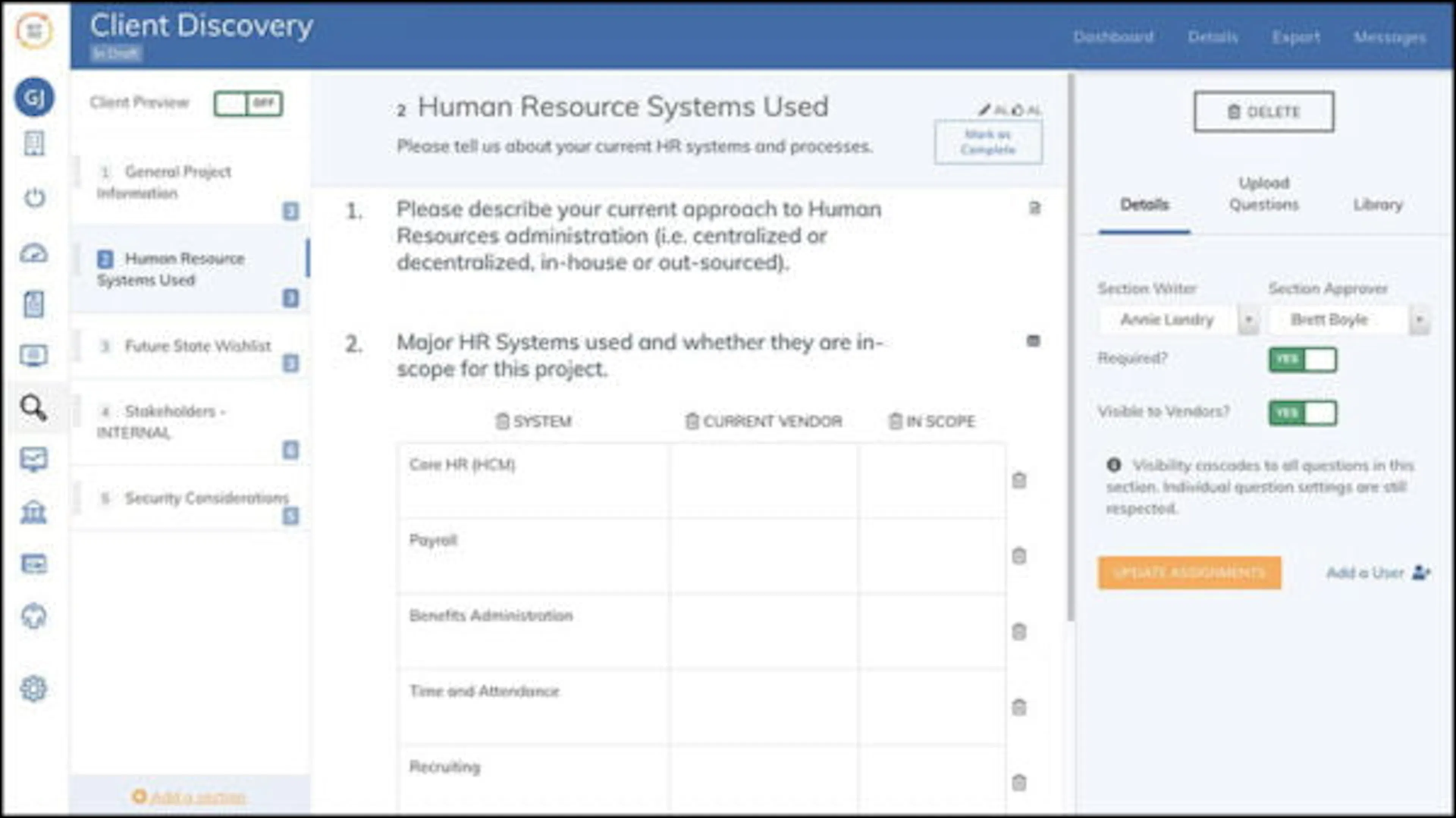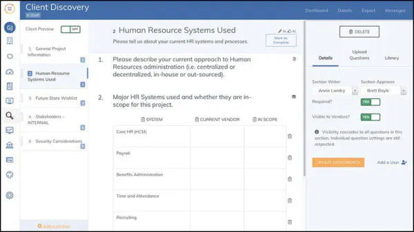 Our client discovery questionnaire quickly captures essential details from clients and makes any of their responses visible to vendors if you link them to the RFP. It all happens online in one place, so everyone is informed and focused on the right outcome.