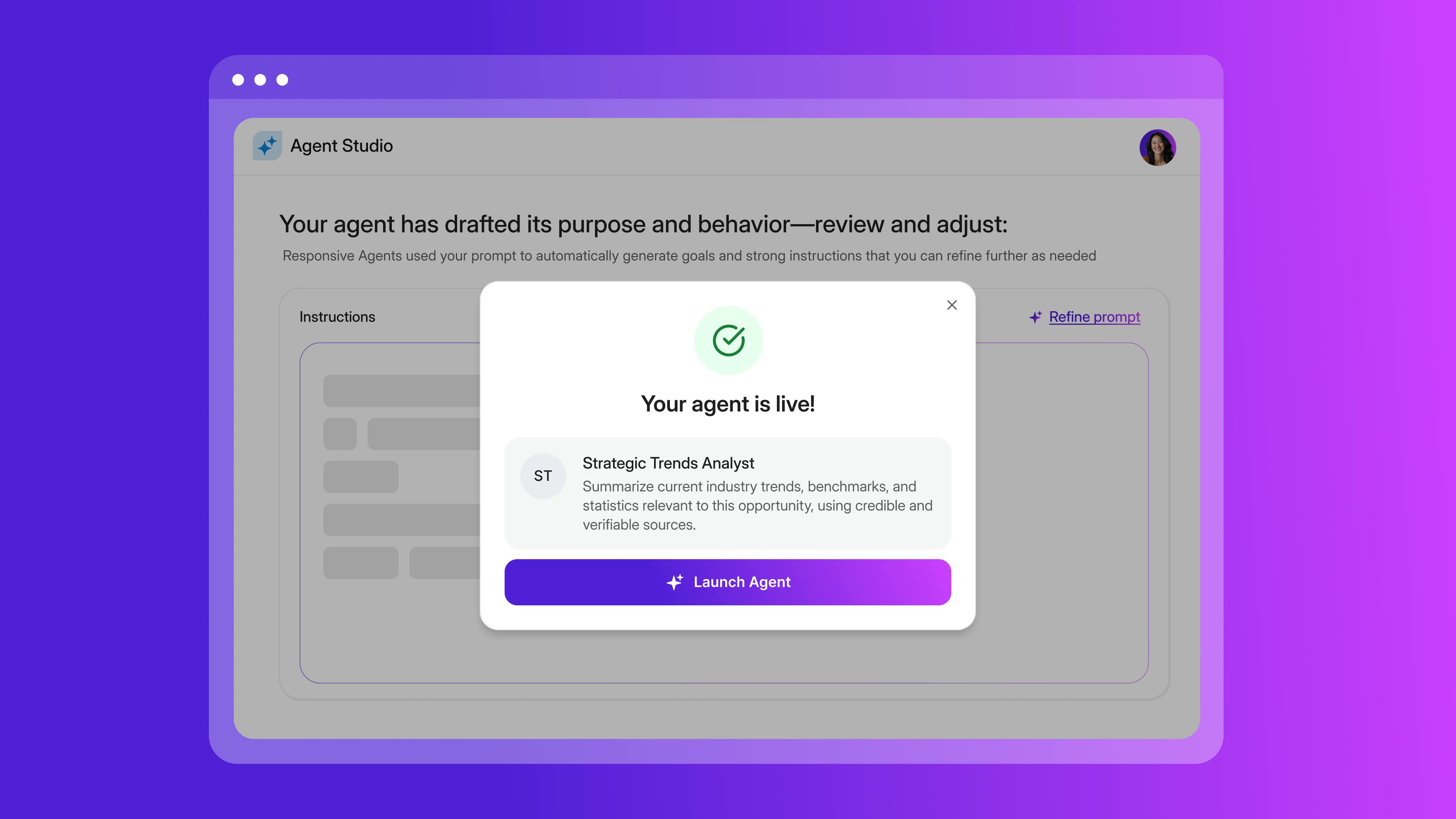 Agent Studio makes building with AI as intuitive as using it. Every agent starts with a simple idea: define the task, provide context, and let the platform handle the structure. Within minutes, teams can move from an idea to a working agent ready for use in Ask and across the Responsive Platform.