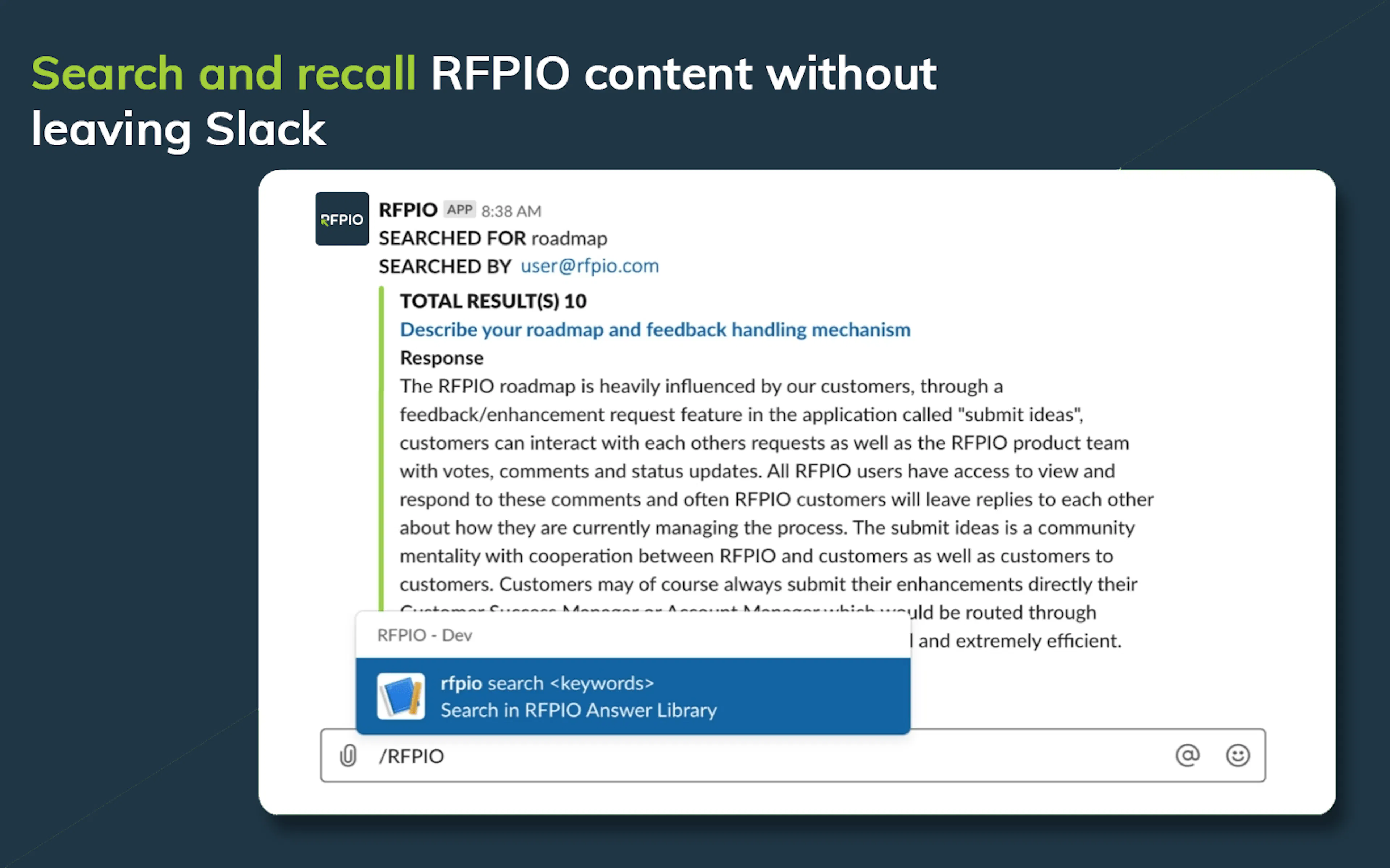Successful proposal teams can also use RFPIO to access their organization’s content management system directly from third-party collaboration tools they’re already using. In a few clicks of a button, they can find information about anything you have stored in your content library—from the most up-to-date company description to next quarter’s product roadmap.