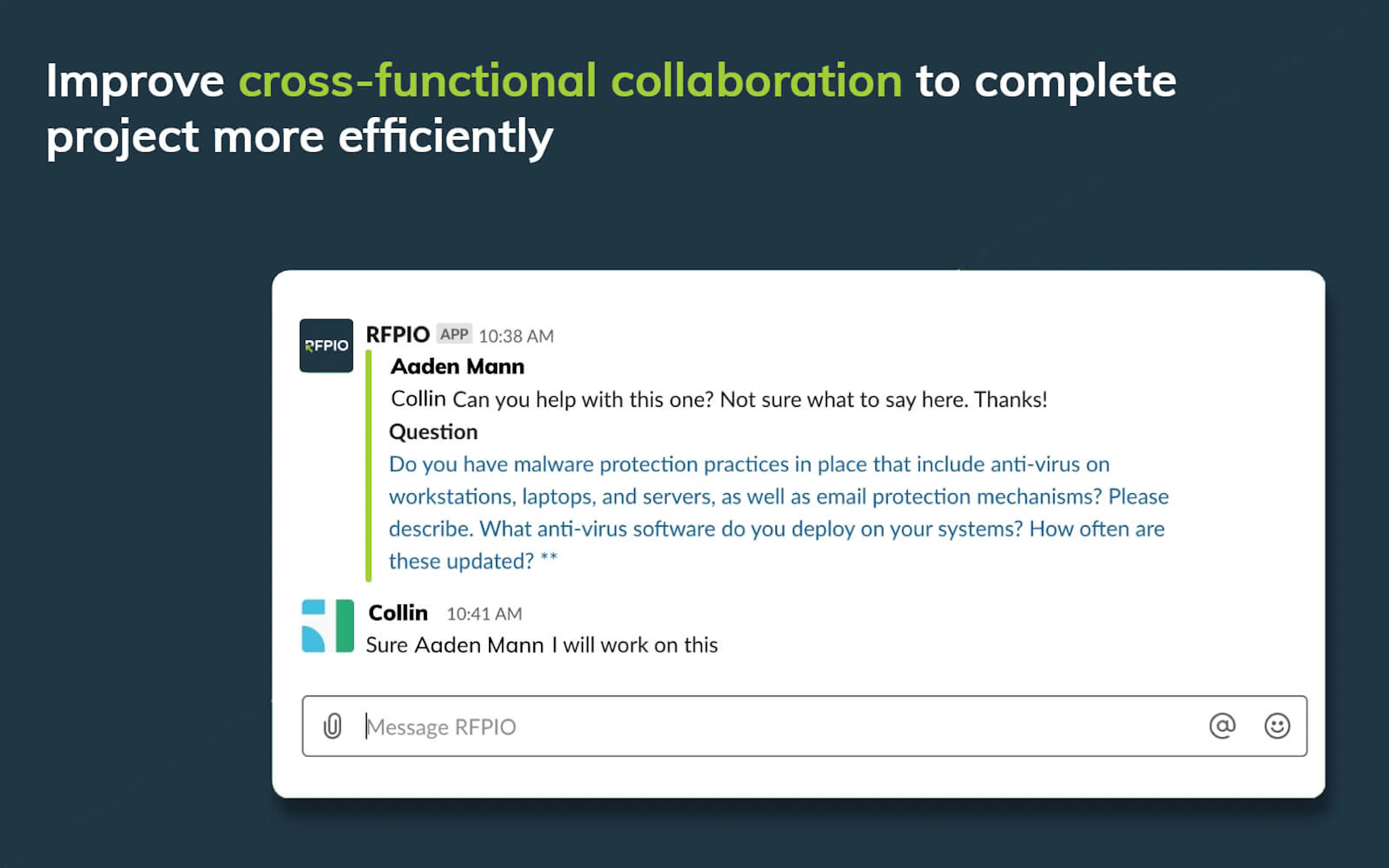 With email, it’s inevitable that something will slip through the cracks. Slack is a nice complement to RFP software, because team members can communicate more effectively.