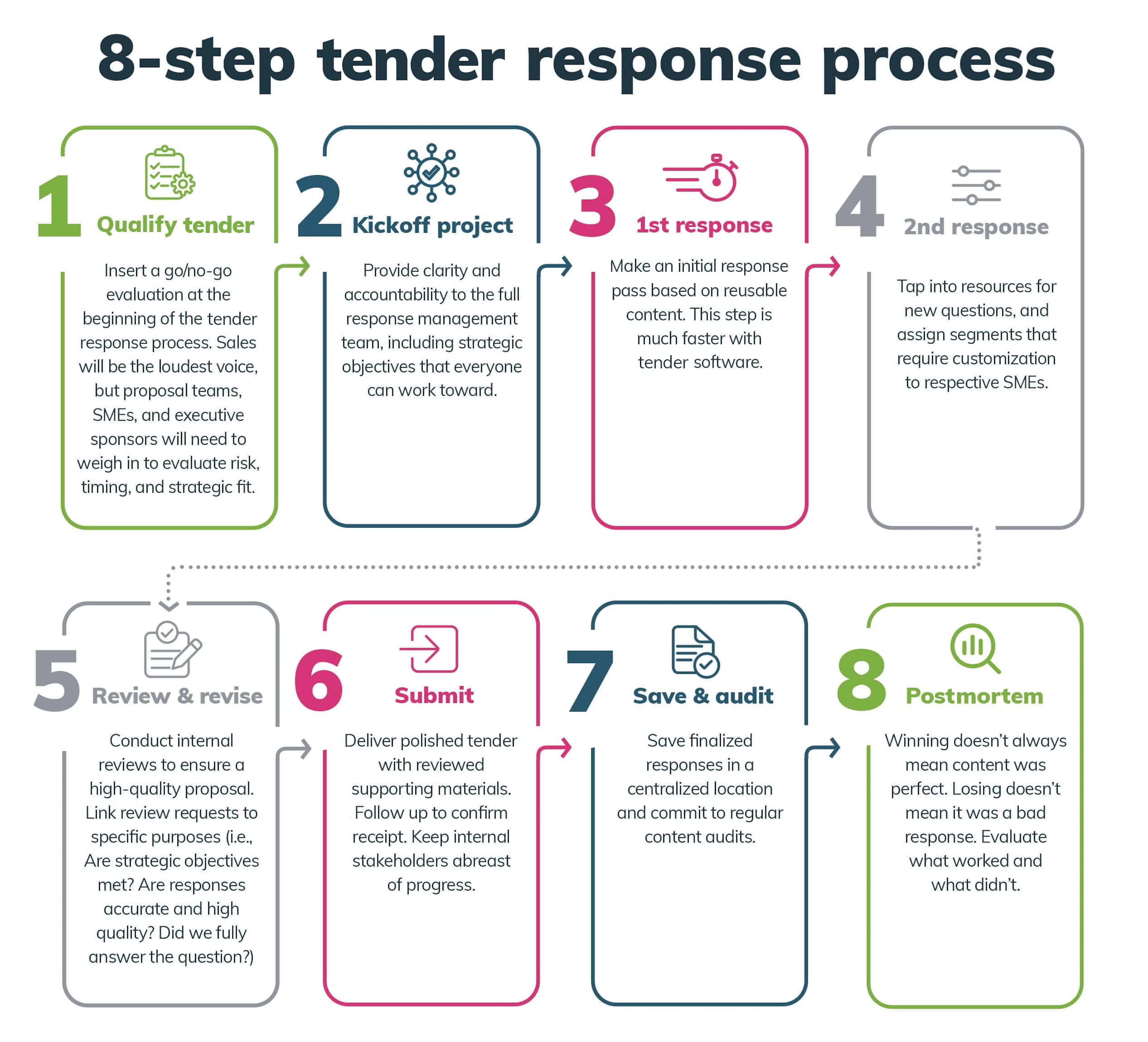 As with RFPs and all other questionnaires a potential customer might send, tenders are detailed, specific legal documents with zero leeway deadlines. As such, it’s critical that companies design a repeatable response process before the next tender reaches their inbox.
