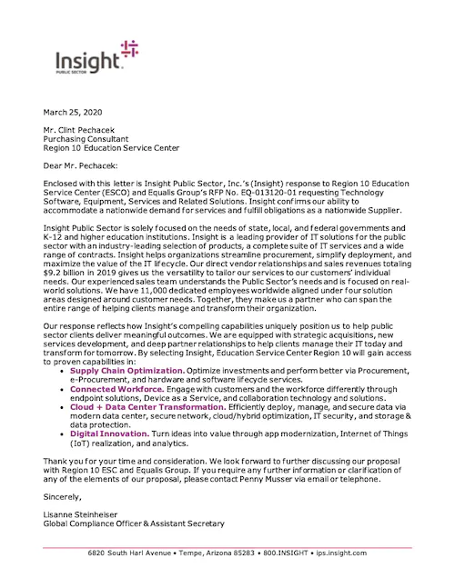 Sample proposal cover letter – Insight Public Sector to Education Service Center (ESCO)
