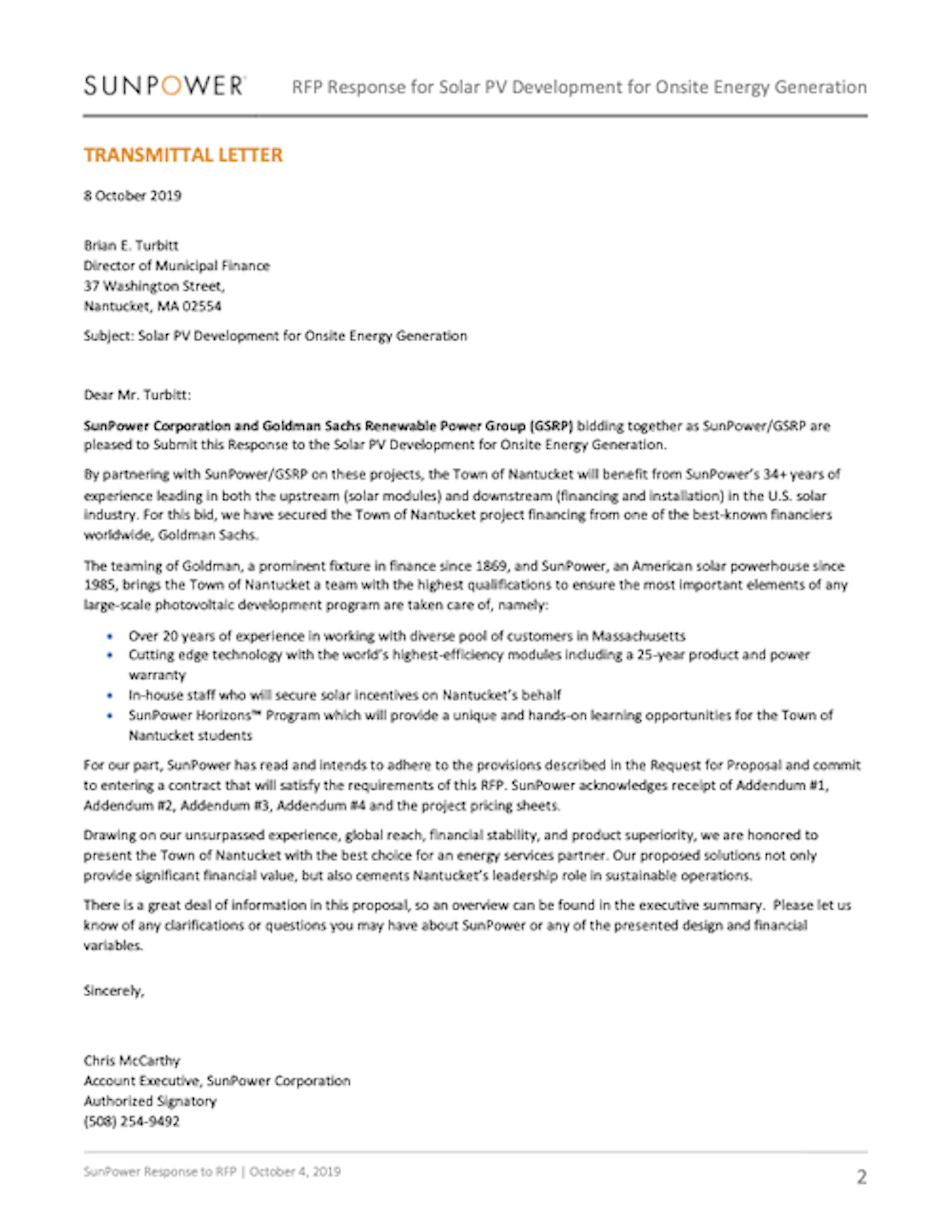 Proposal transmittal letter example – SunPower/GSRP for Town of Nantucket