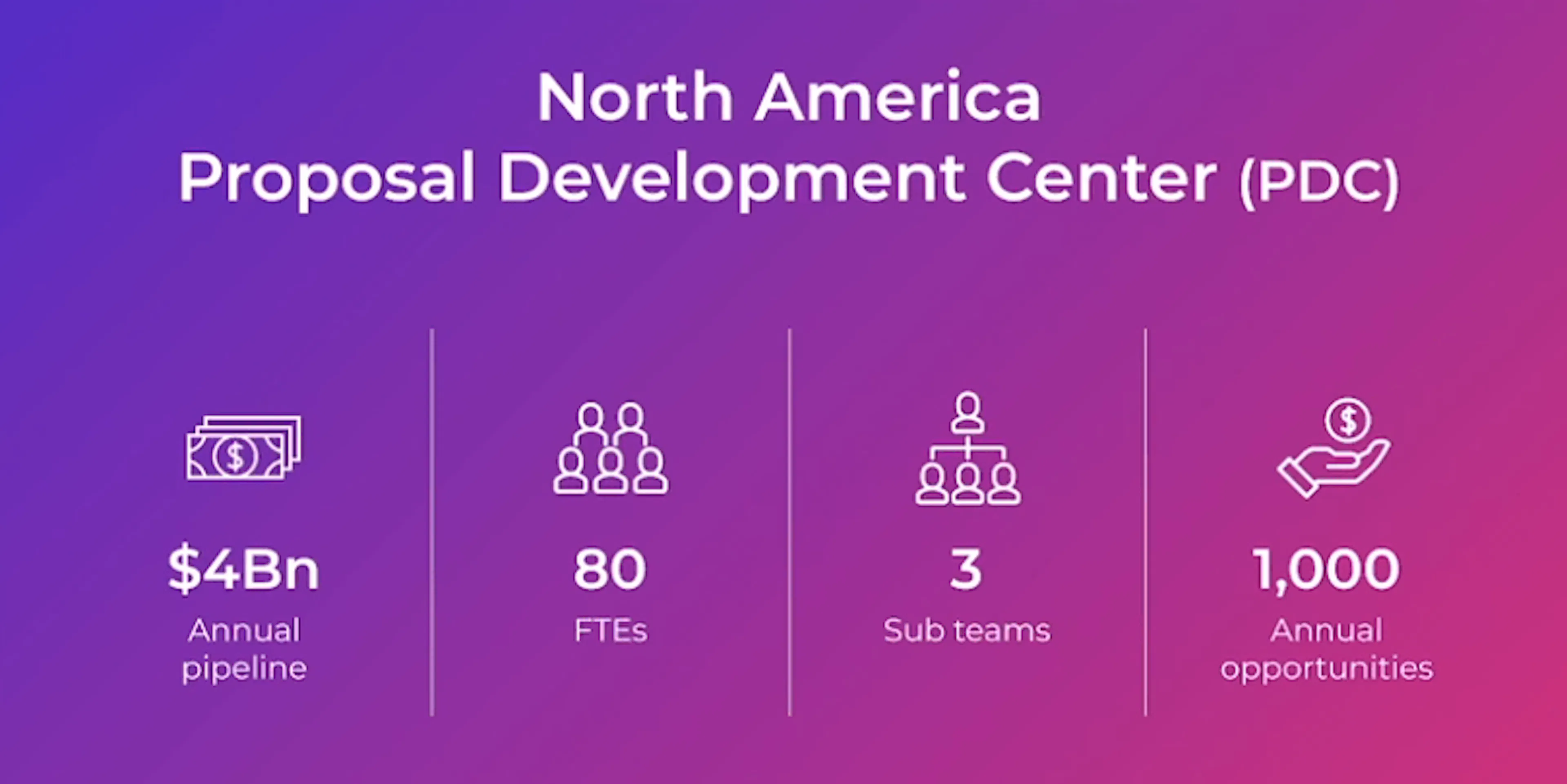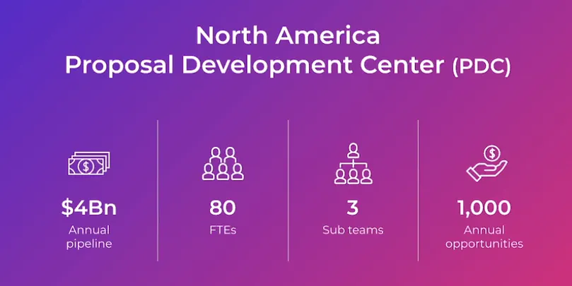 As the VP of the Proposal Development Center, Danelle runs the North America Response Team, which has over 80 full-time employees across three subteams. Last year, the team managed 1,000 opportunities valued at $4B in annual revenue.