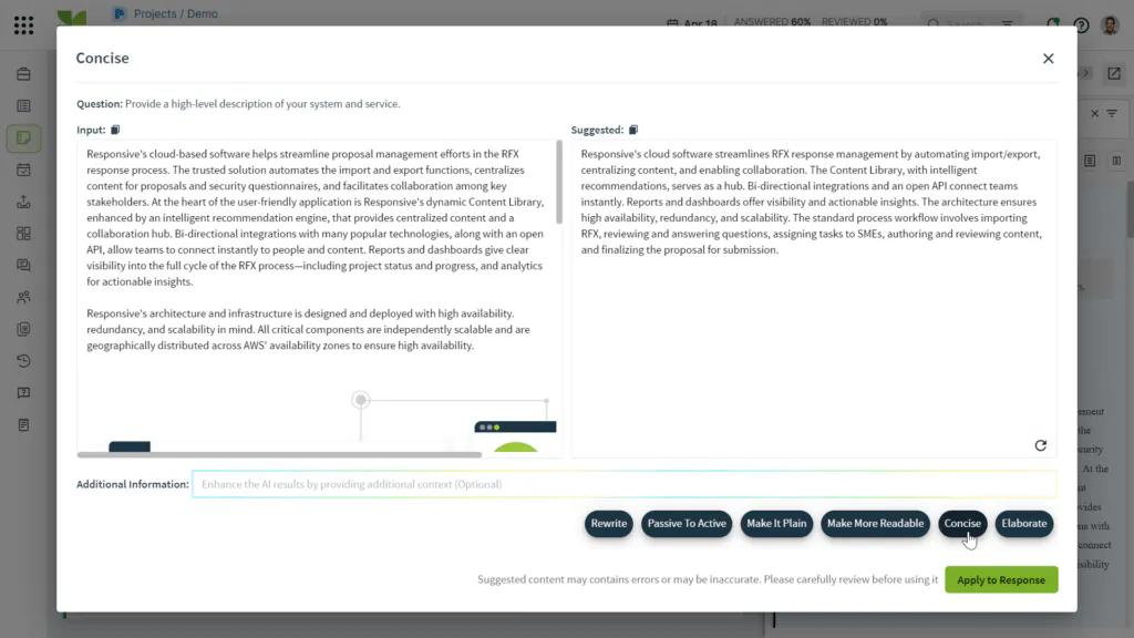 JAGGAER was an early adopter of Responsive AI Assistant, which enables them to respond to questions with pre-authored “best of” answers from past responses or generate original responses in seconds using built-in prompts. Once a response is generated, users can refine it even further by selecting functions such as “Rewrite,” “Concise” or “Make More Readable” from a dropdown menu.