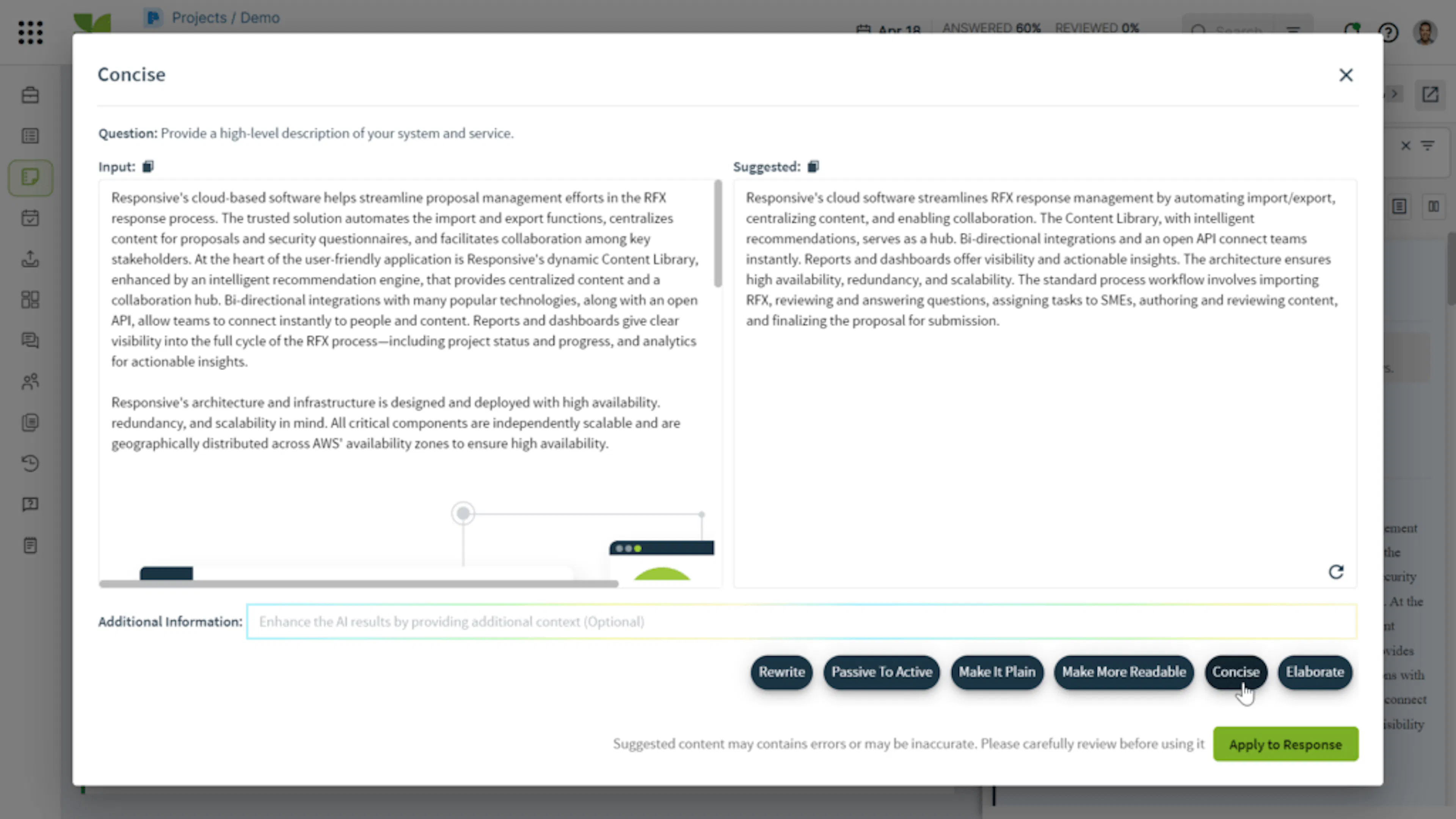 First, Autumn walked through a demo of AI Assistant. Second, she set up a meeting between Responsive and leads from JAGGAER’s cybersecurity, legal and cloud ops departments to address any concerns live and in real time. Responsive AI Assistant is trained from JAGGAER’s Content Library, and none of that information is exposed to the public GPT or Internet — which helped alleviate all privacy, security and compliance concerns.