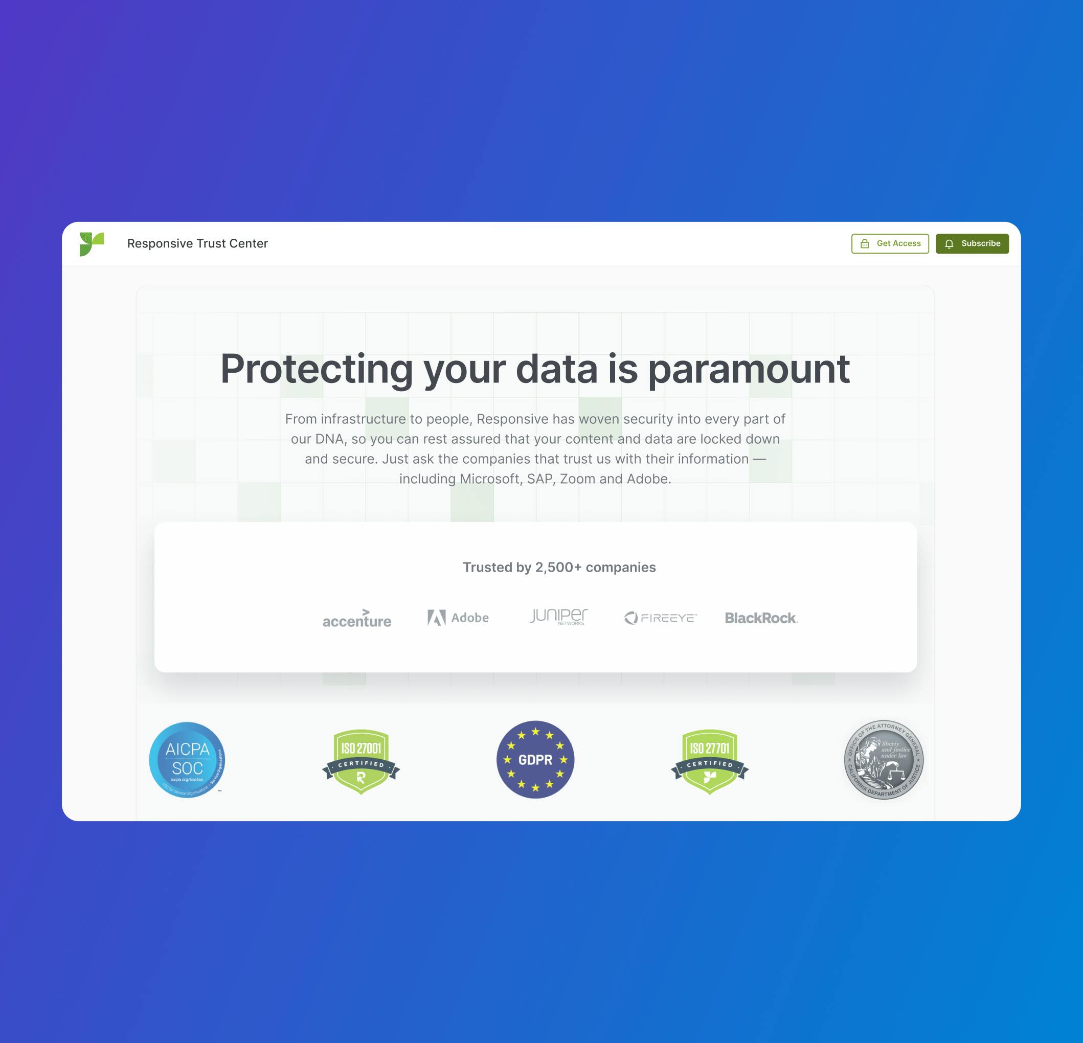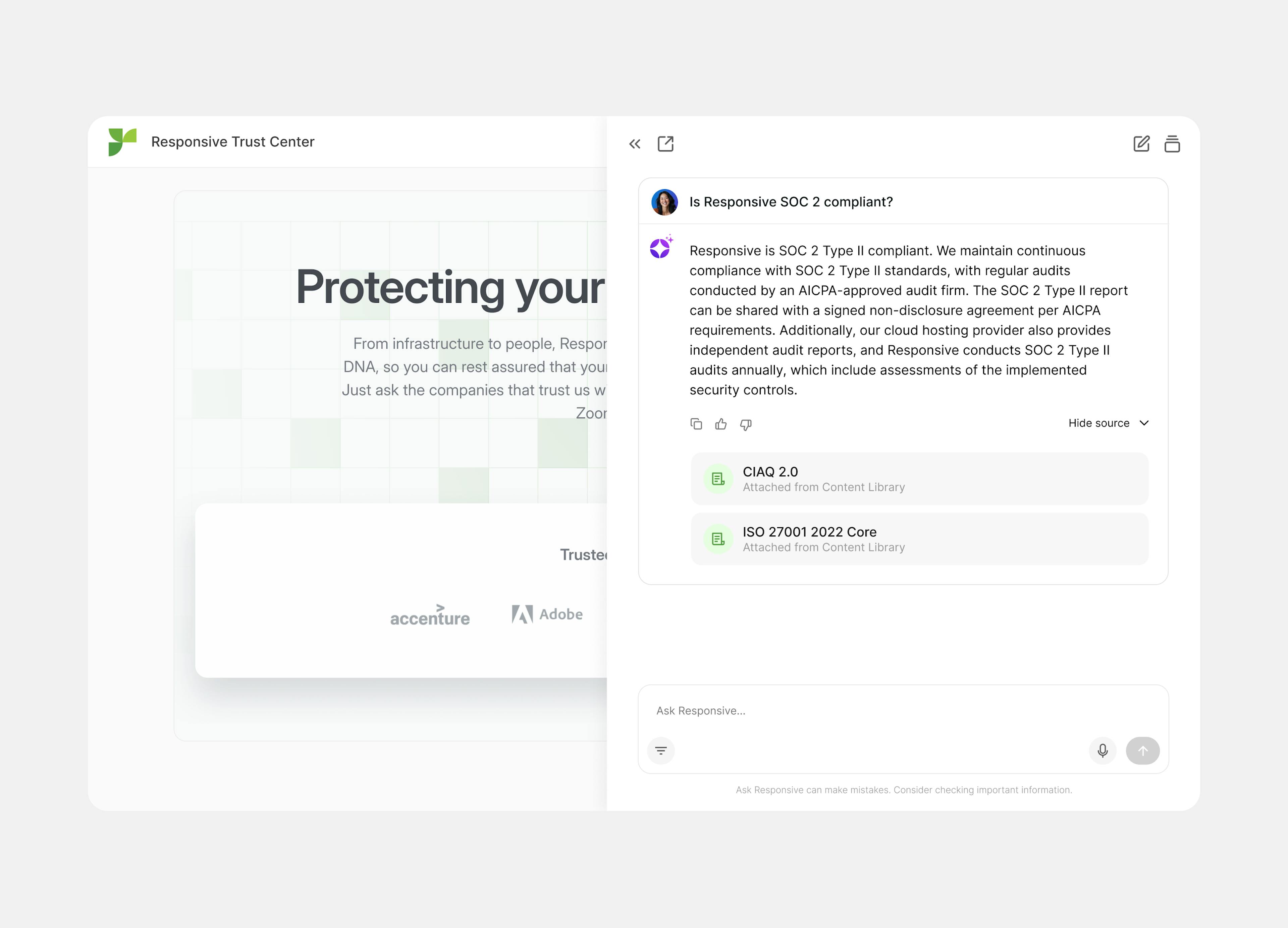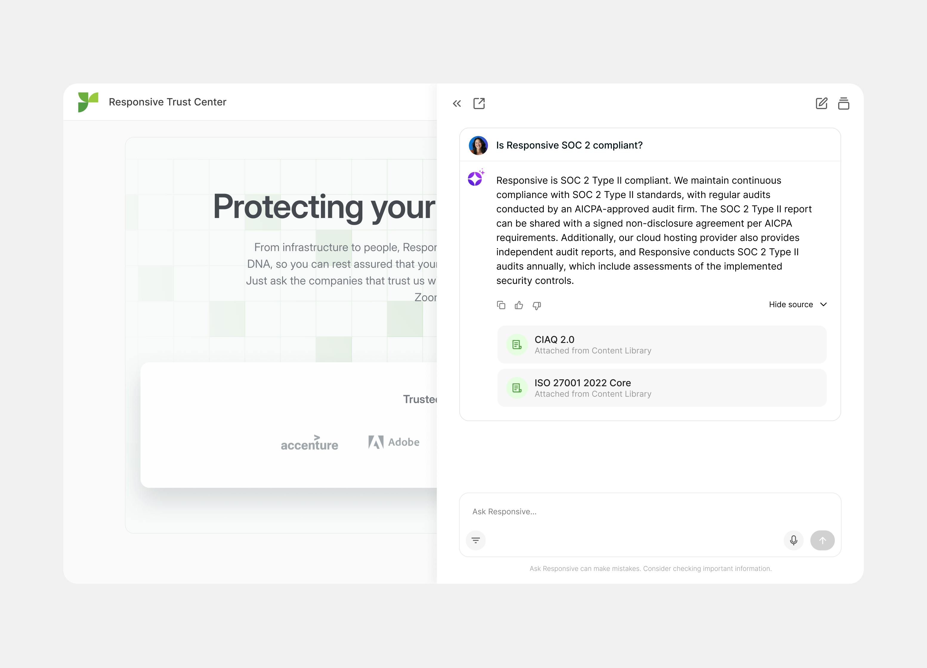 - Use Ask by Responsive to power AI-driven search and answers across your Trust Center using only approved content.