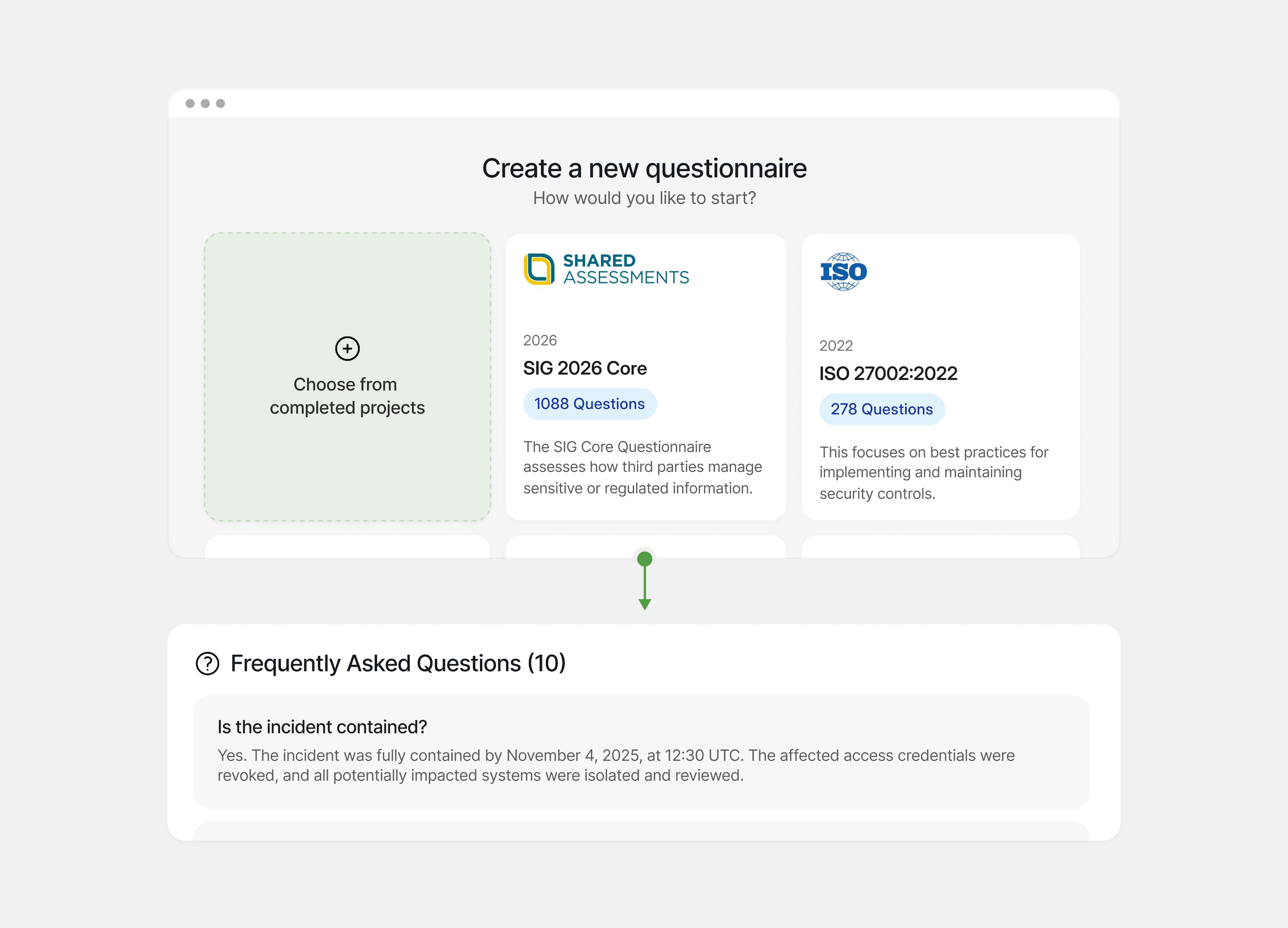 - Access officially licensed SIG and CAIQ templates, along with additional questionnaire templates such as ISO and DORA.