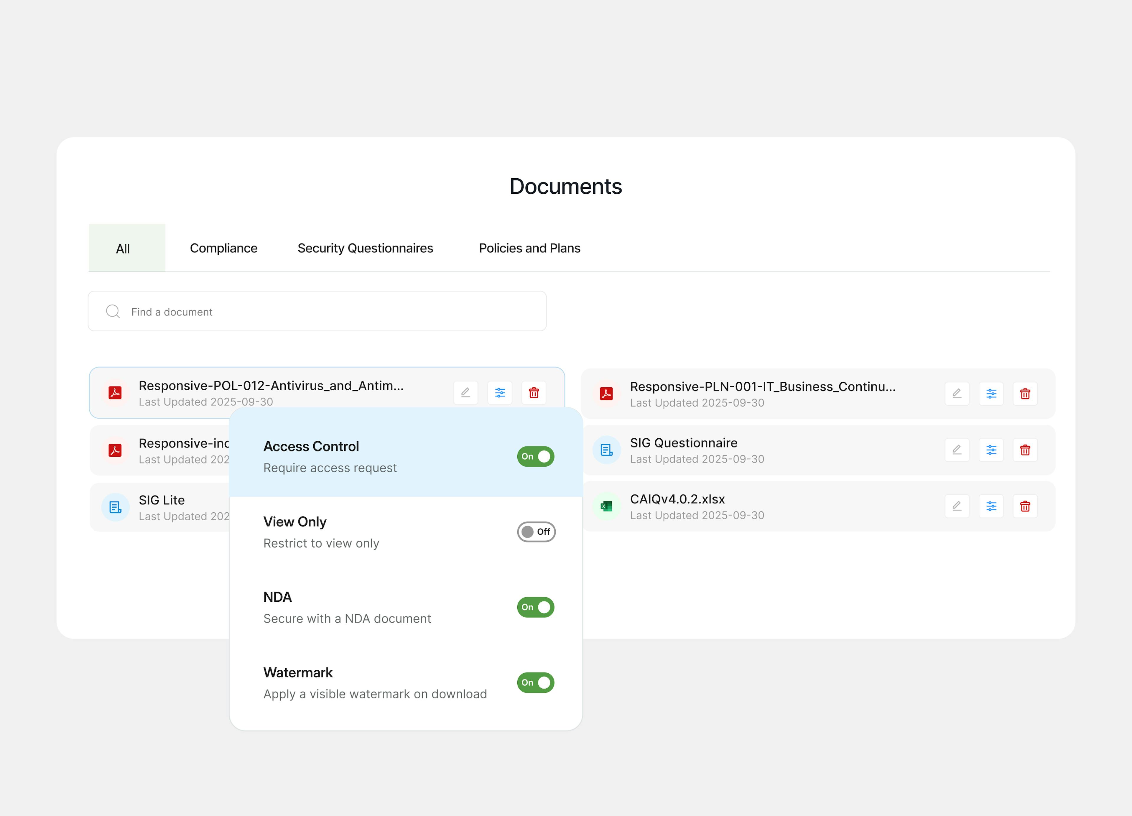Store certifications, risk assessments, compliance, and security documents in one secure hub. Customers and auditors can search for answers in Responsive without interrupting your team.