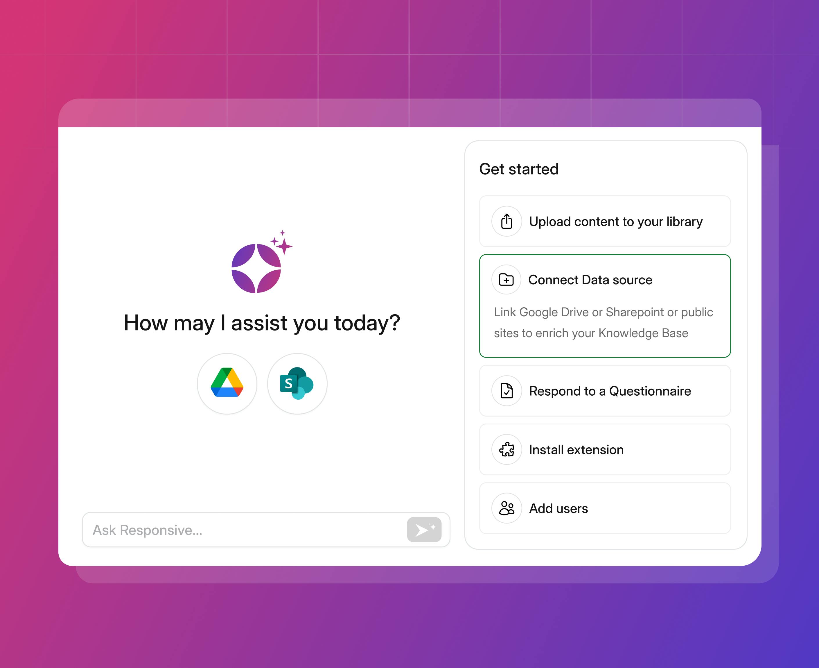 - Upload documents or connect Google Drive/SharePoint, and Responsive Lite builds a usable library in minutes.