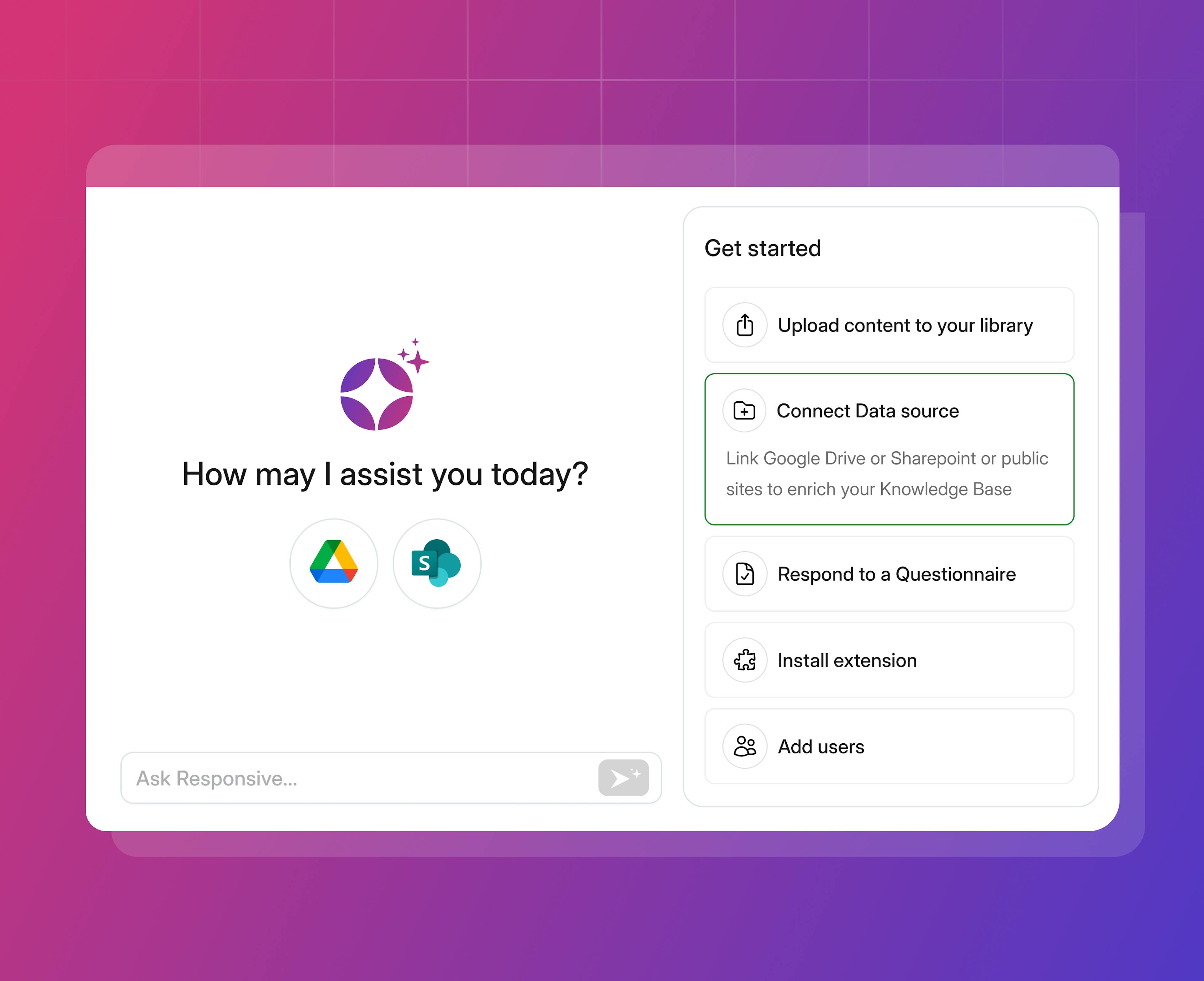 Upload your docs, connect to Google Drive or SharePoint, and Responsive Lite builds a usable library in minutes. Skip the heavy setup and start responding fast.